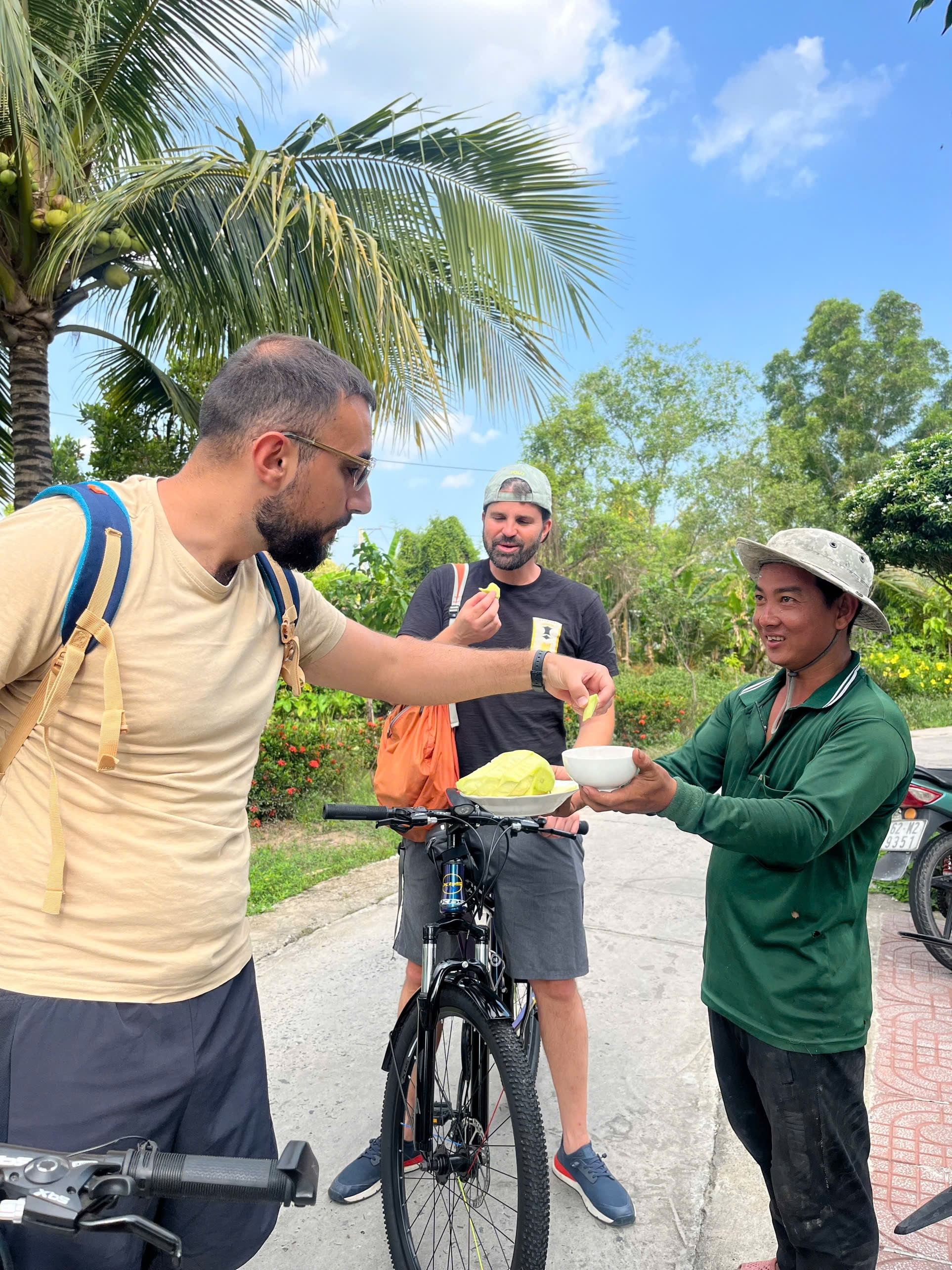 Local Fruits Discovery: Bike through riverside fruit gardens where golden mangoes, spiky jackfruits, star apples, and pineapples ‘tempt’ you with their seasonal fragrance and flavor. Your guide will share how farmers grow and take care of these tasty fruits.