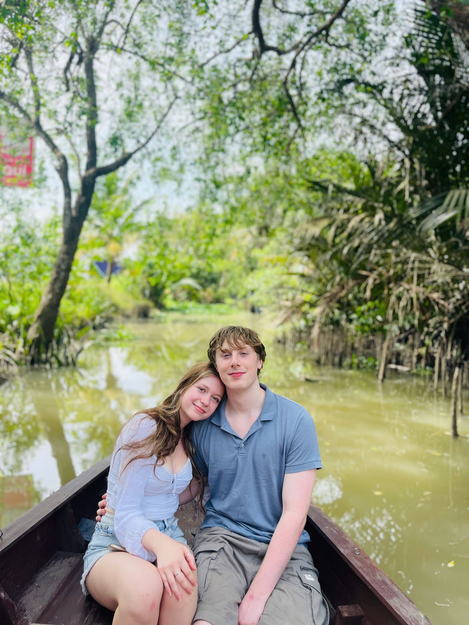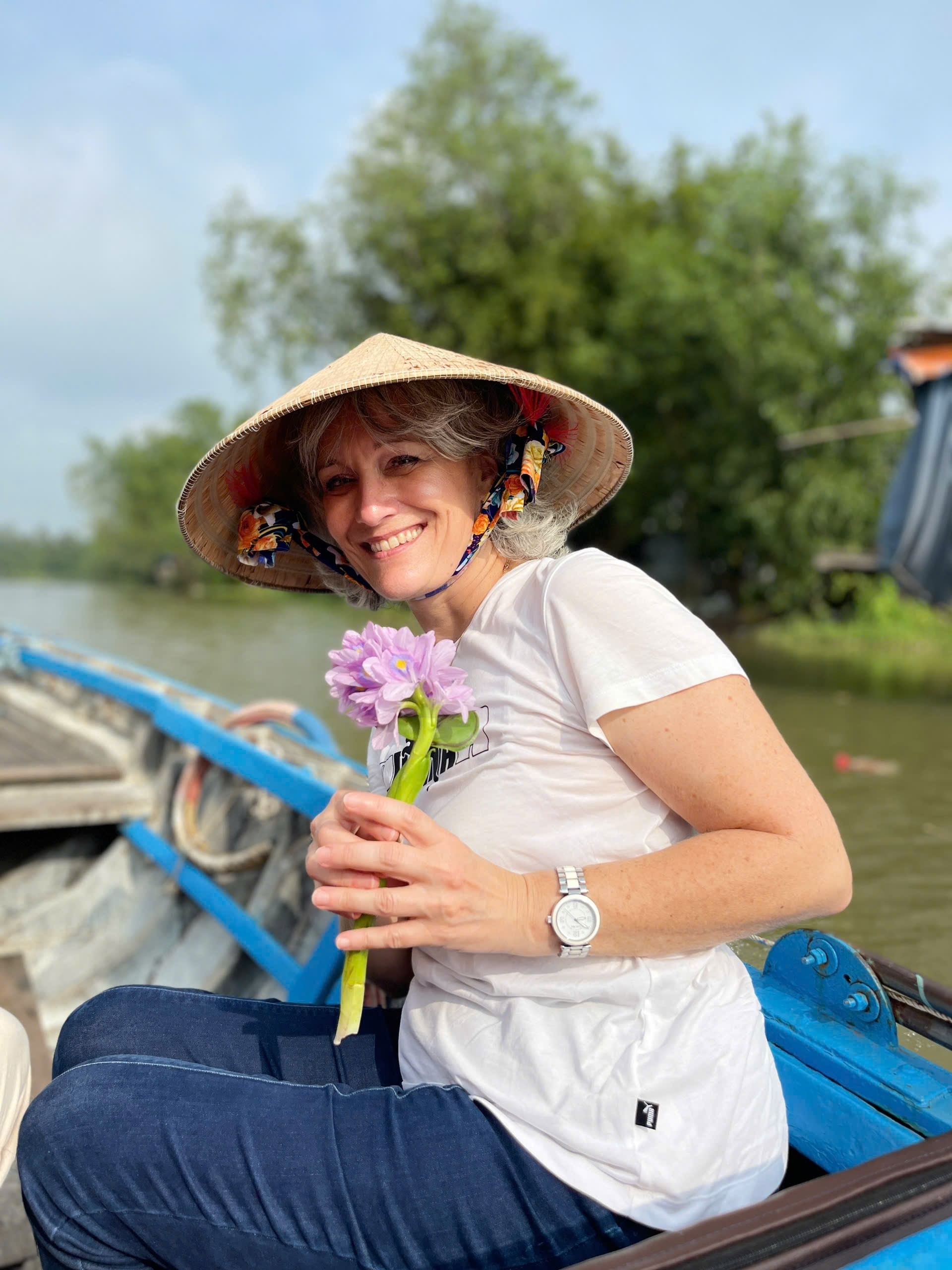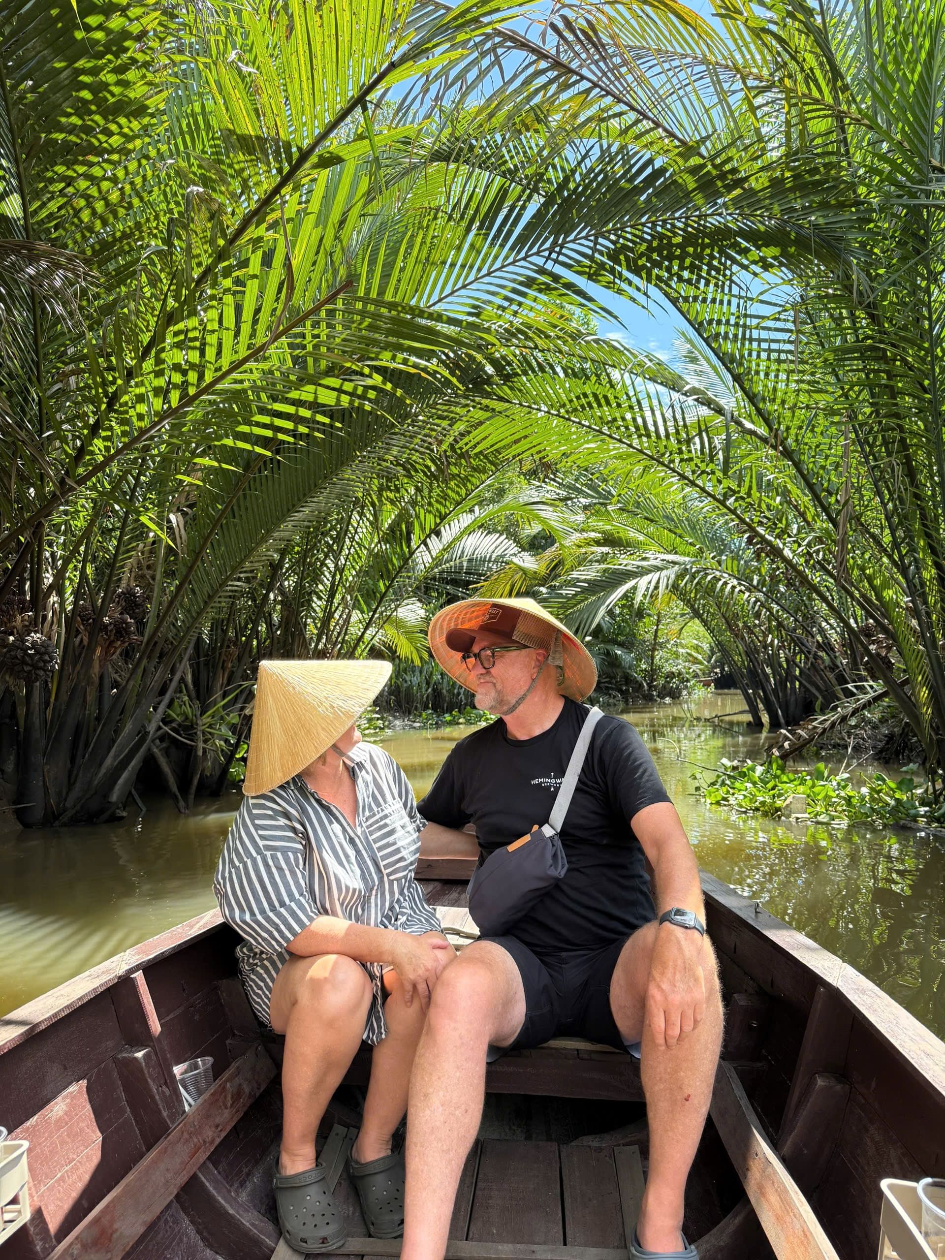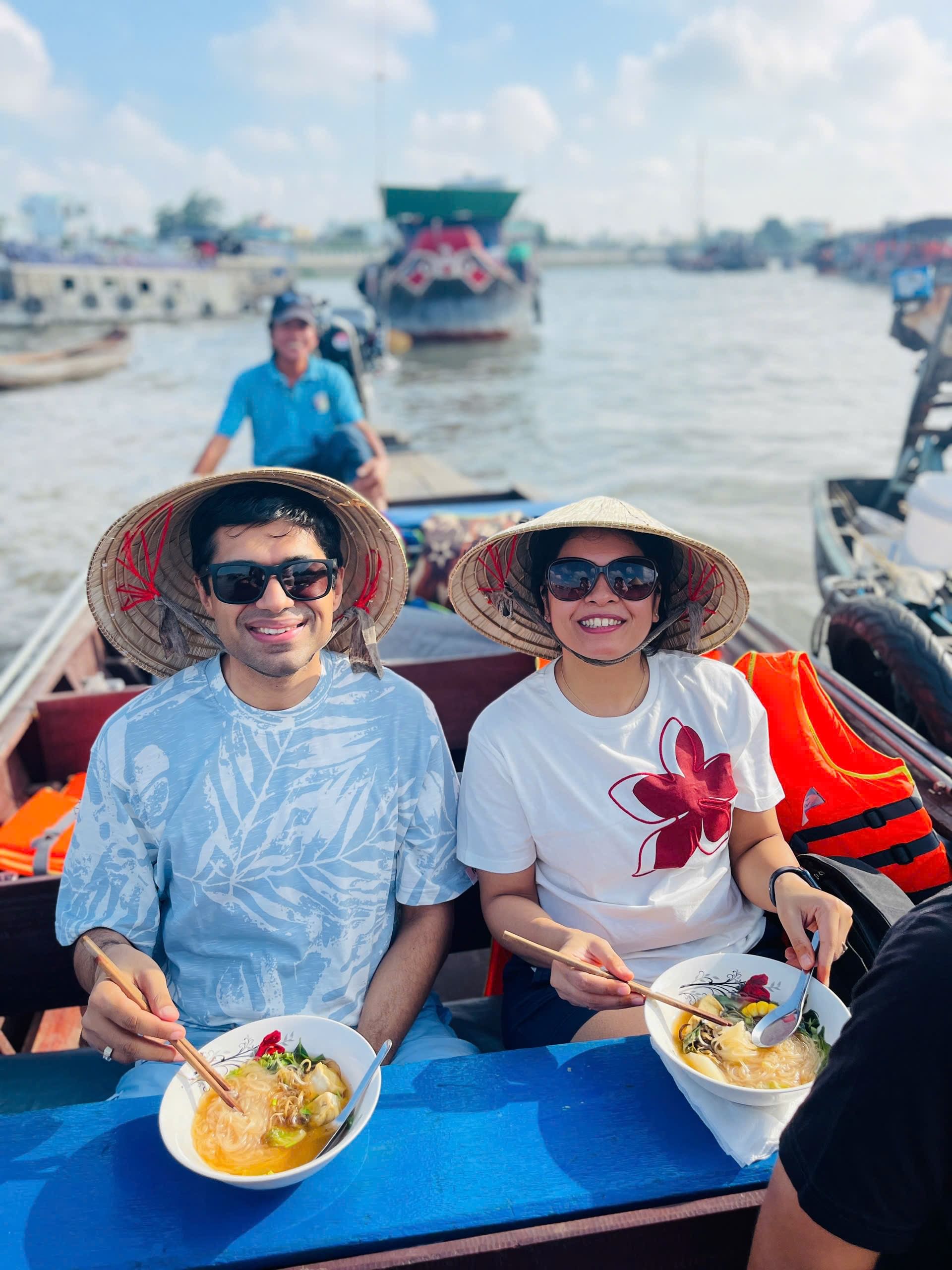 Cai Rang Floating Market: Feel the warmth of smiling faces as you float among lively boats filled with pineapples, watermelons, and vegetables while enjoying warm ‘shaking’ rice noodle soup and rich Vietnamese coffee right on the water.